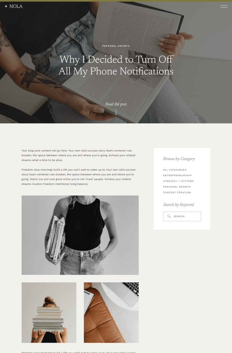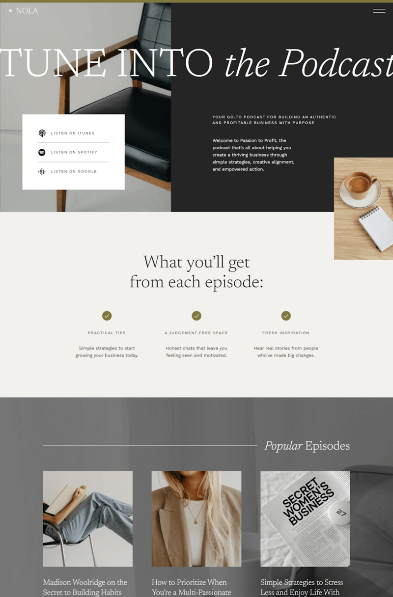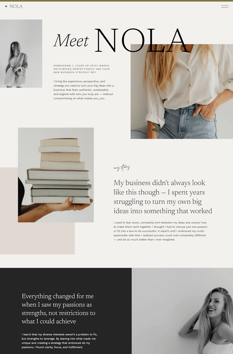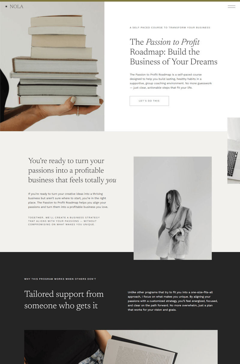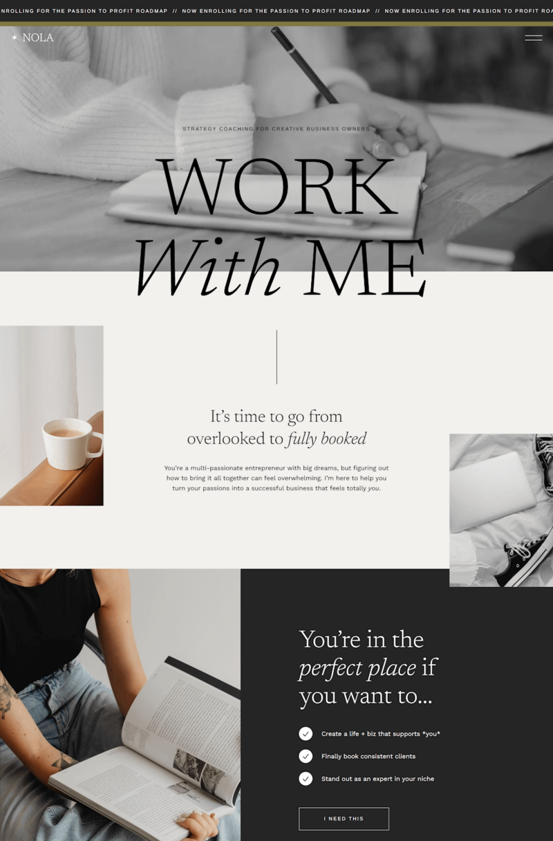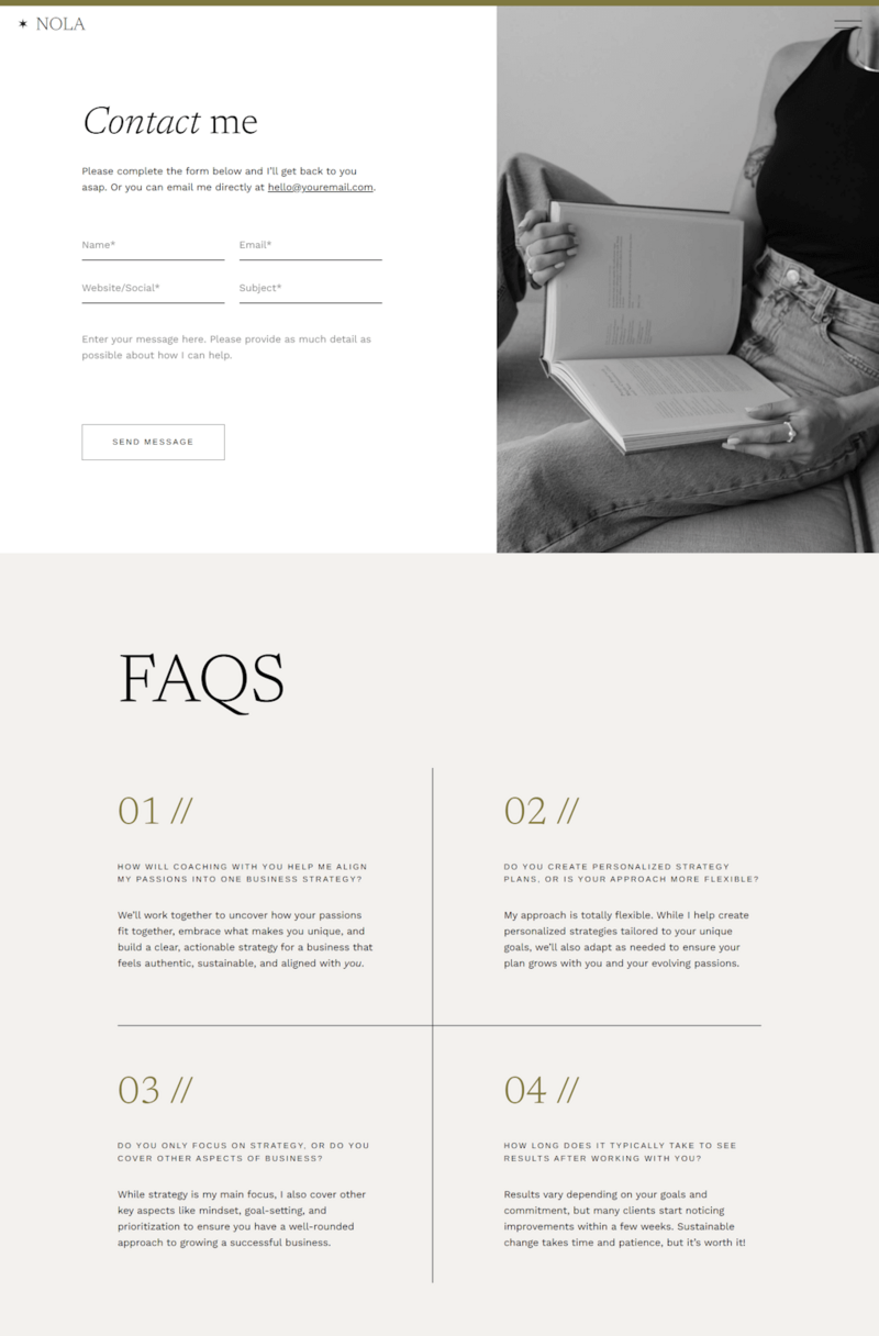 Nola was created with business coaches, strategists, and consultants in mind, but its fully-customizable design makes it perfect for any coach, creative, or entrepreneur with an online business.